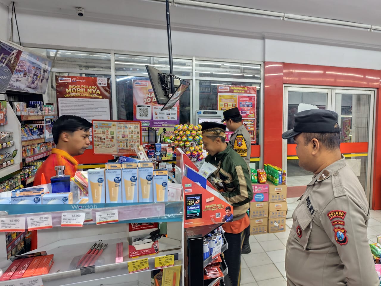 Personil melakukan patroli di minimarket dan bertemu karyawan toko setempat sembari menyampaikan himbauan tentang kewaspadaan terhadap gangguan Kamtibmas.