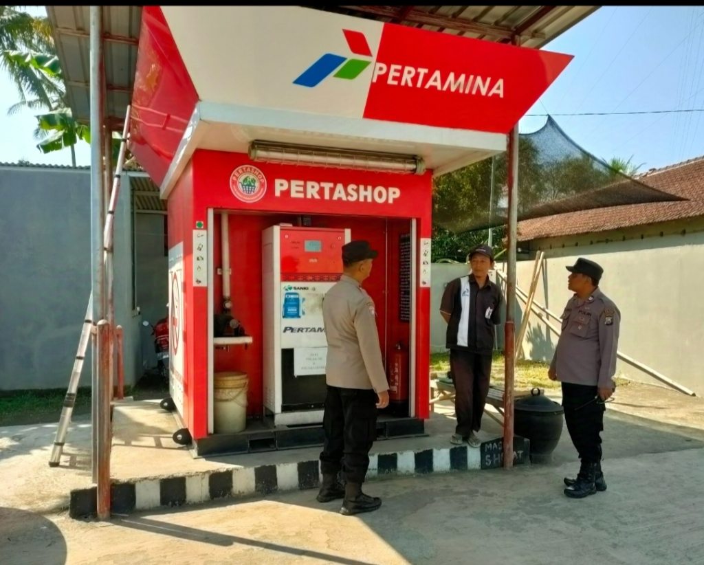 Anggota Polsek Nglegok melaksanakan patroli dialogis dengan karyawan pertashop di Desa Penataran dan warga yang mengisi BBM (24 September 2025).