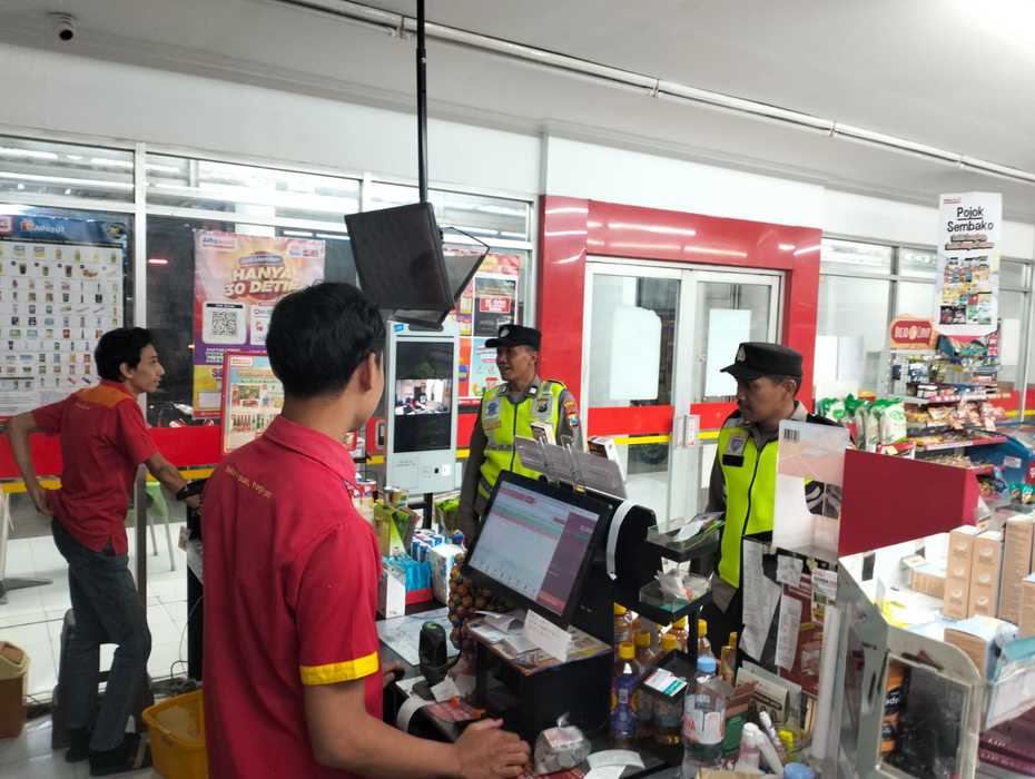 Personil melakukan patroli di minimarket dan bertemu karyawan toko setempat sembari menyampaikan himbauan tentang kewaspadaan terhadap gangguan Kamtibmas.