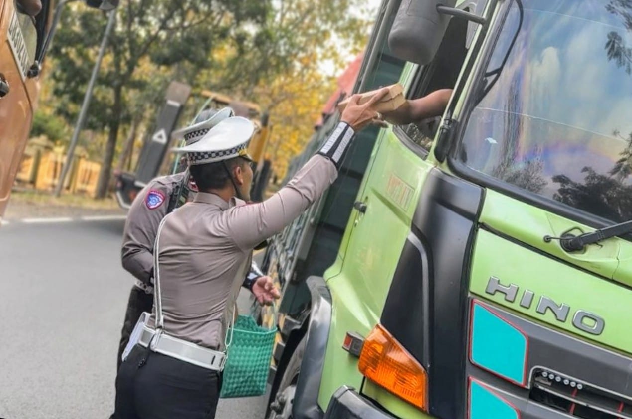 Para personel membagikan ratusan nasi kotak dan air minum kepada pengendara dan penumpang yang terjebak macet selama berjam-jam pada Kamis 24 Juli 2025 kemarin.