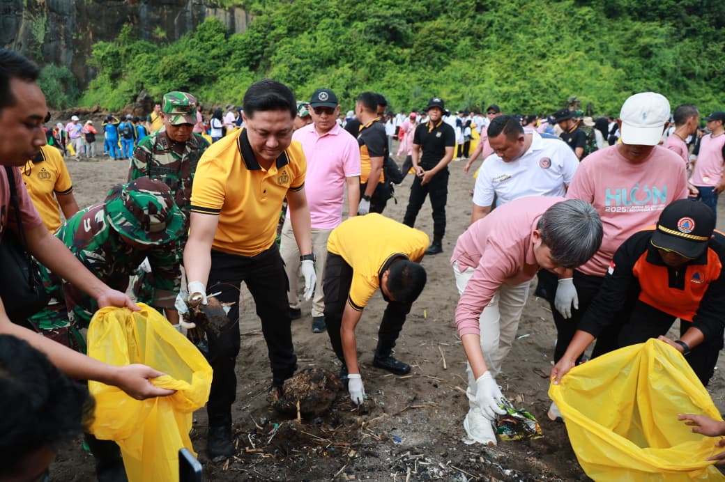 Sejumlah Pejabat Utama Polres Jember, Muspika Kabupaten Jember yang terdiri dari unsur TNI, pemerintah kecamatan, desa, serta elemen masyarakat menyisir dan membersihkan sampah di pesisir pantai.