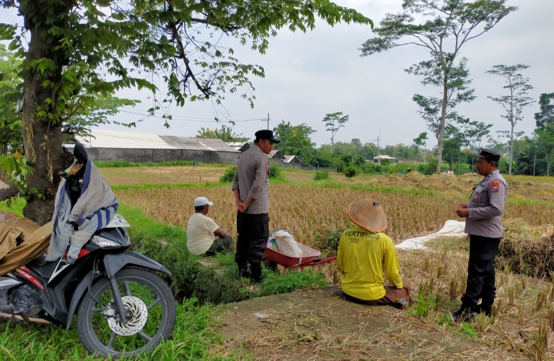 Dalam patroli mobiling kali ini, anggota Polsek Nglegok memberi himbauan kamtibmas kepada warga petani yang mencari rumput dan mengolah tanah pertanian di Desa Modangan.