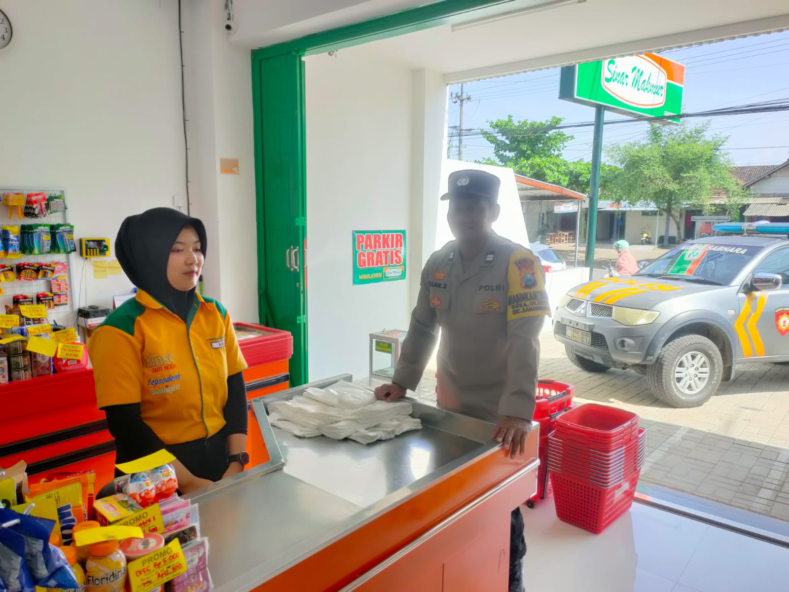 Polsek Sanankulon – Untuk menekan angka kejahatan yang terjadi di wilayah hukum Polsek Sanankulon, petugas Unit Sabhara melaksanakan kegiatan patroli dialogis kamtibmas yang dipimpin oleh KSPKT Aiptu Heru Setyo Budi beserta anggota dengan sasaran pusat pertokoan maupun obyek vital lainnya. Petugas juga berdialogis dengan karyawan minimarket sembari menyampaikan himbauan kamtibmas agar selalu waspada dan berhati hati saat melayani pembeli.