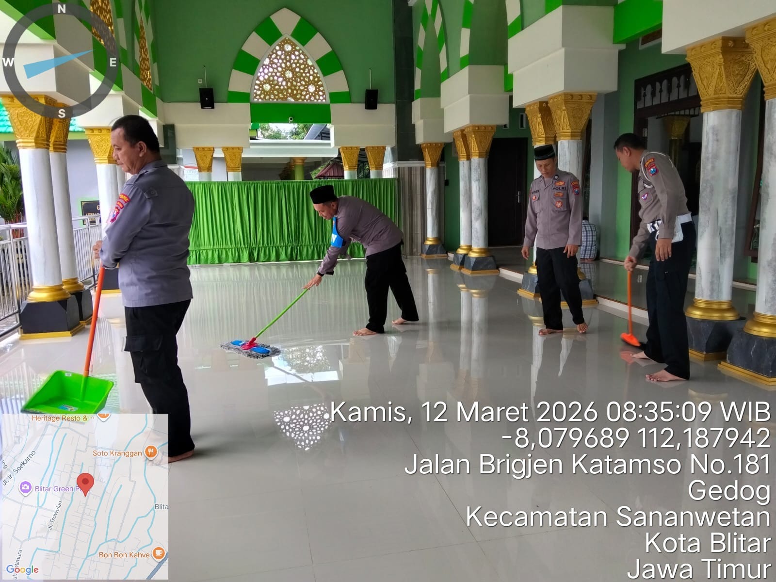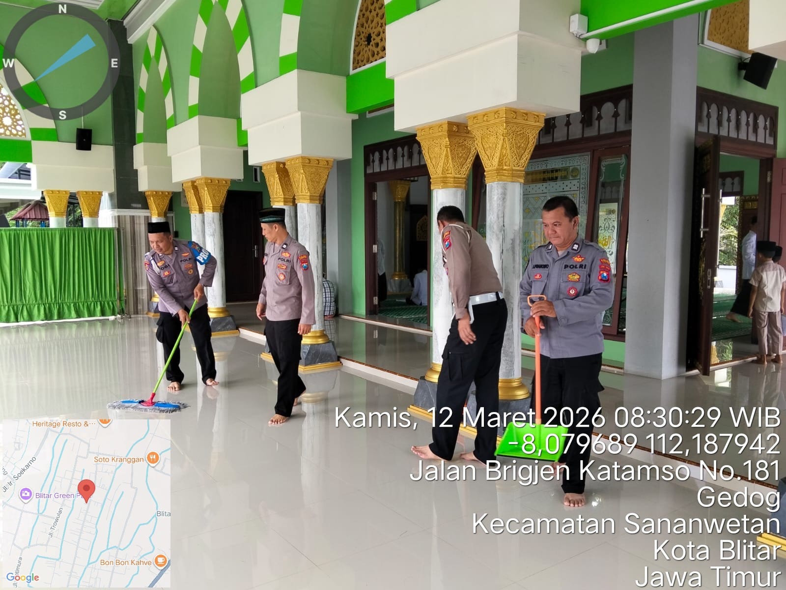 Dalam rangka mendukung program pemerintah Gerakan Indonesia Asri, anggota Polsek Sananwetan melaksanakan kegiatan kerja bakti atau korve di lingkungan Masjid Al Wahyu yang berlokasi di Jalan Brigjen Katamso, Kelurahan Gedog, Kecamatan Sananwetan, Kota Blitar. Kegiatan tersebut dilaksanakan pada hari Kamis, 12 Maret 2026 mulai pukul 08.30 WIB hingga pukul 09.00 WIB.