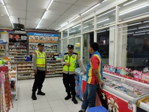 Personil melakukan patroli di minimarket dan bertemu karyawan toko setempat sembari menyampaikan himbauan tentang kewaspadaan terhadap gangguan Kamtibmas.