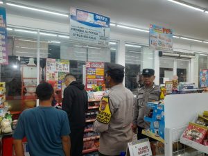 Personil melakukan patroli di minimarket dan bertemu karyawan toko setempat sembari menyampaikan himbauan tentang kewaspadaan terhadap gangguan Kamtibmas.