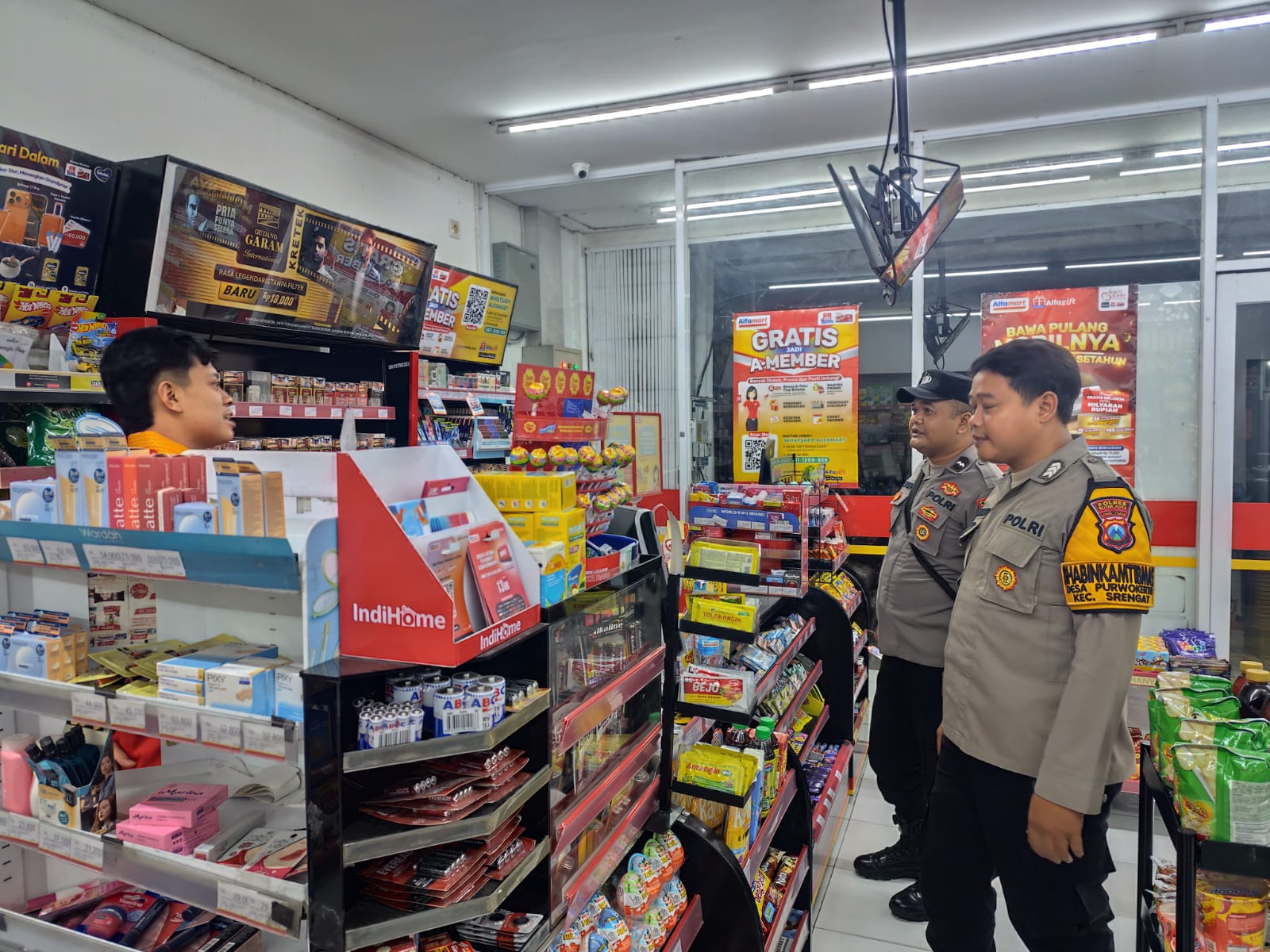 Personil melakukan patroli di minimarket dan bertemu karyawan toko setempat sembari menyampaikan himbauan tentang kewaspadaan terhadap gangguan Kamtibmas.