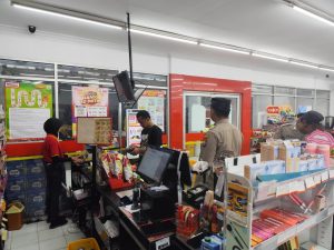 Personil melakukan patroli di minimarket dan bertemu karyawan toko setempat sembari menyampaikan himbauan tentang kewaspadaan terhadap gangguan Kamtibmas.