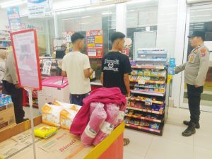 Personil melakukan patroli di minimarket dan bertemu karyawan toko setempat sembari menyampaikan himbauan tentang kewaspadaan terhadap gangguan Kamtibmas.