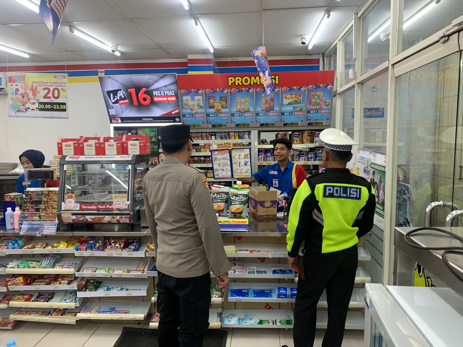 Personil melakukan patroli di minimarket dan bertemu karyawan toko setempat sembari menyampaikan himbauan tentang kewaspadaan terhadap gangguan Kamtibmas.