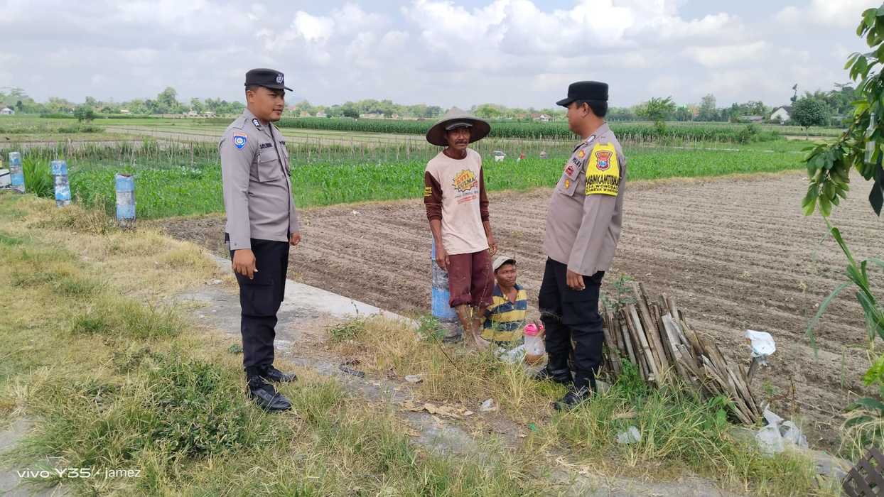 Dalam kegiatan tersebut, tampak personel Bhabinkamtibmas dan unit patroli Polsek Wonodadi berinteraksi langsung dengan para petani yang sedang berada di sawah. Petugas menyampaikan imbauan kamtibmas terkait pentingnya menjaga keamanan lingkungan, serta mewaspadai adanya tindak kriminalitas seperti pencurian hasil panen atau alat pertanian.