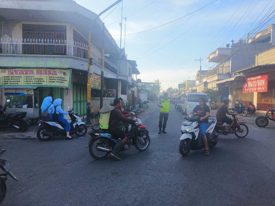 Petugas lalu lintas Polsek Wonodadi dikerahkan untuk mengatur arus kendaraan, membantu penyeberang jalan, serta mencegah kemacetan dan potensi kecelakaan lalu lintas yang kerap terjadi pada jam sibuk pagi hari.