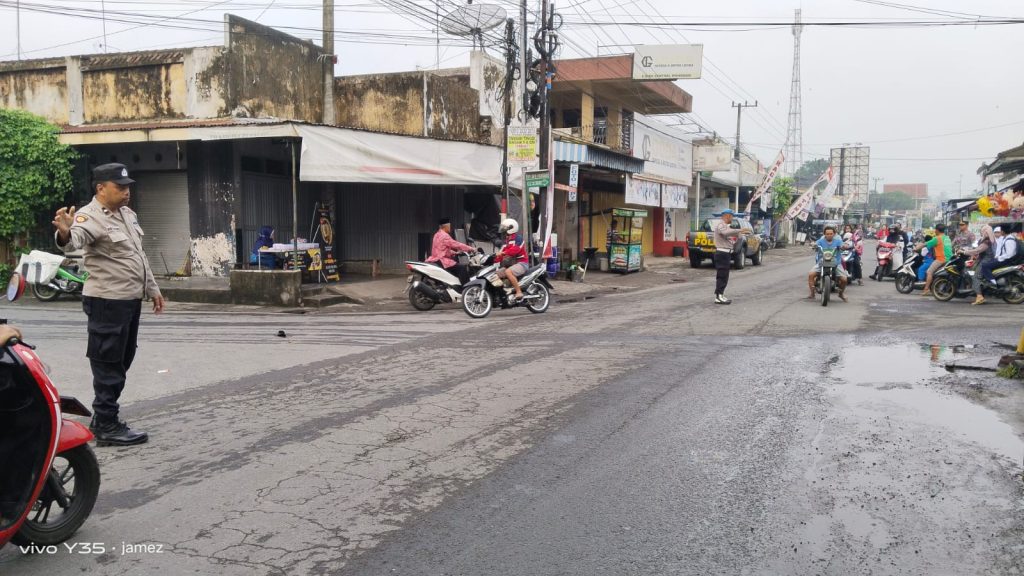 Petugas tampak melaksanakan pengaturan arus lalu lintas, membantu penyeberangan masyarakat dan pelajar, serta memberikan imbauan kepada pengendara agar selalu tertib dan mematuhi peraturan lalu lintas.