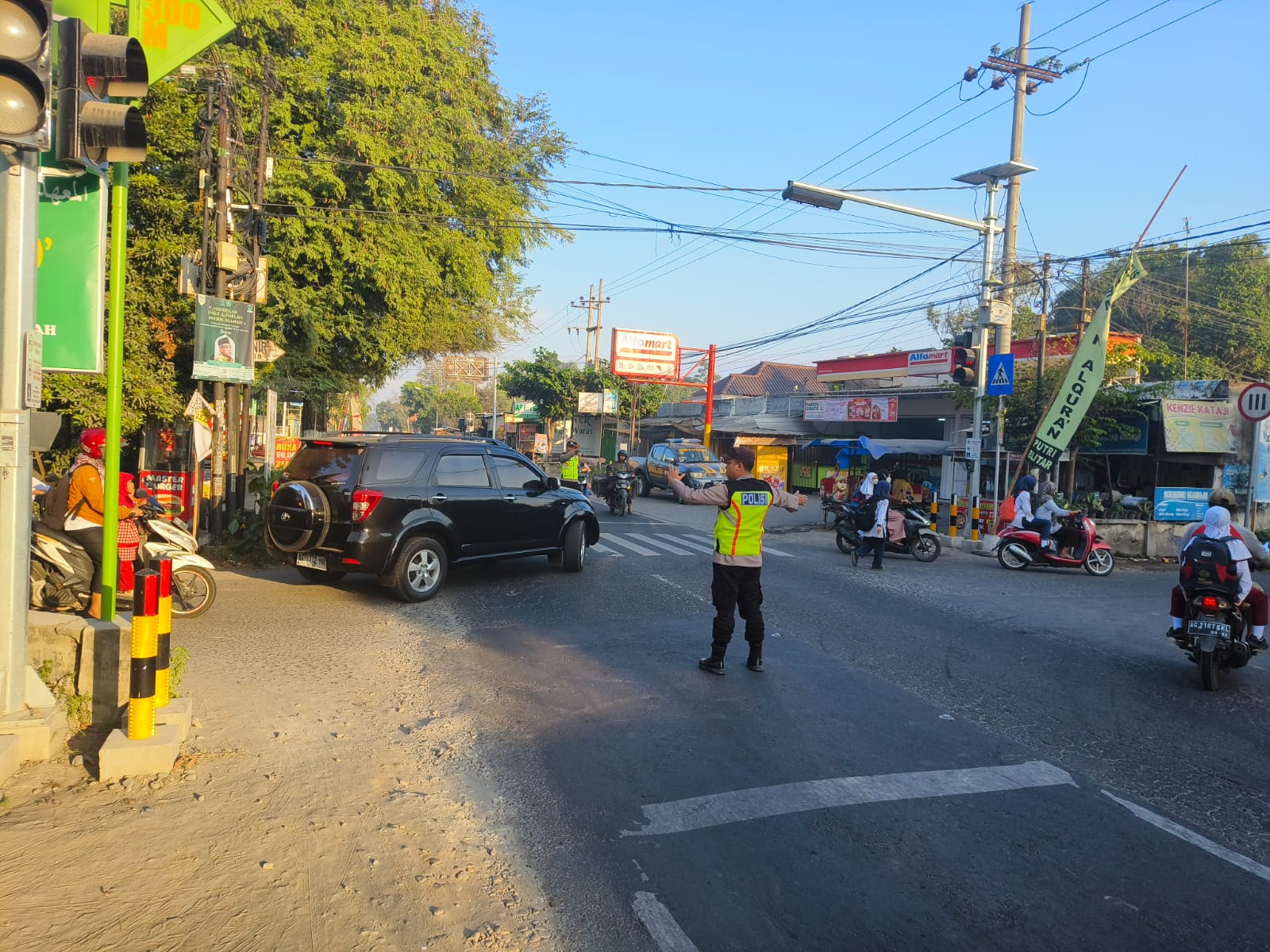Petugas tampak melaksanakan pengaturan arus lalu lintas, membantu penyeberangan masyarakat dan pelajar, serta memberikan imbauan kepada pengendara agar selalu tertib dan mematuhi peraturan lalu lintas.