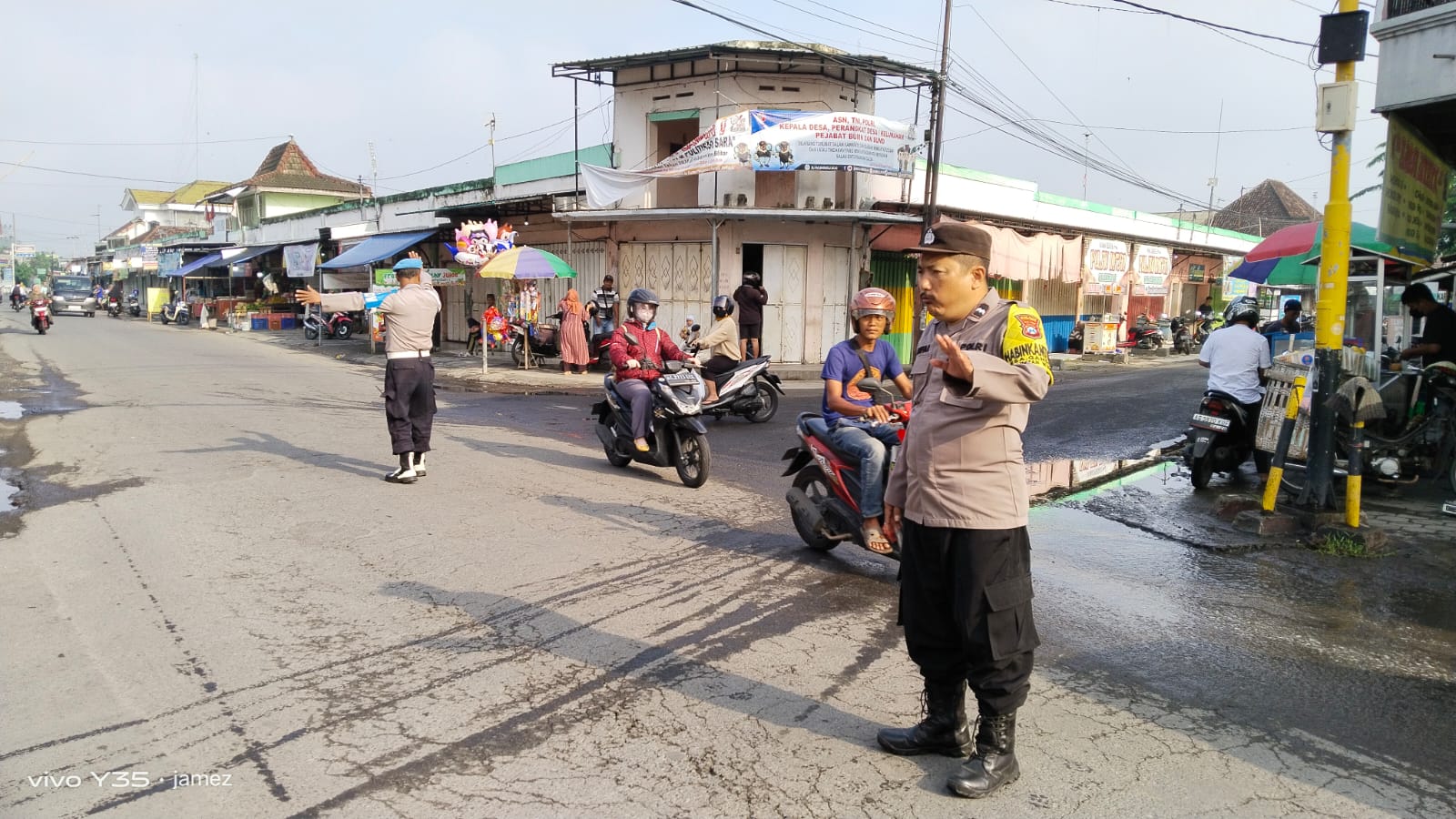 Petugas tampak melaksanakan pengaturan arus lalu lintas, membantu penyeberangan masyarakat dan pelajar, serta memberikan imbauan kepada pengendara agar selalu tertib dan mematuhi peraturan lalu lintas.
