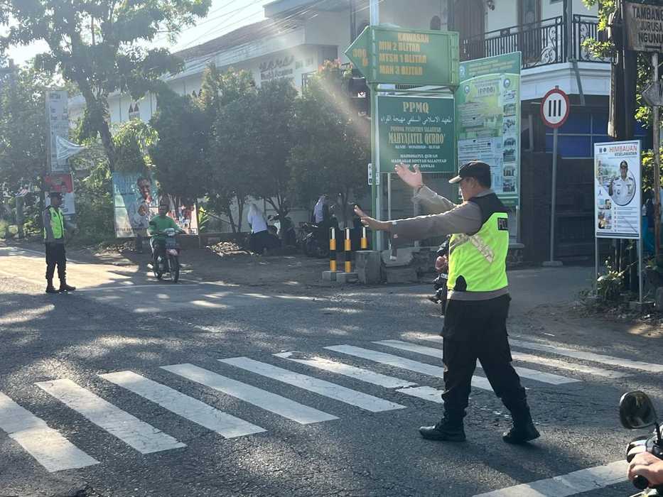 Petugas lalu lintas Polsek Wonodadi dikerahkan untuk mengatur arus kendaraan, membantu penyeberang jalan, serta mencegah kemacetan dan potensi kecelakaan lalu lintas yang kerap terjadi pada jam sibuk pagi hari.