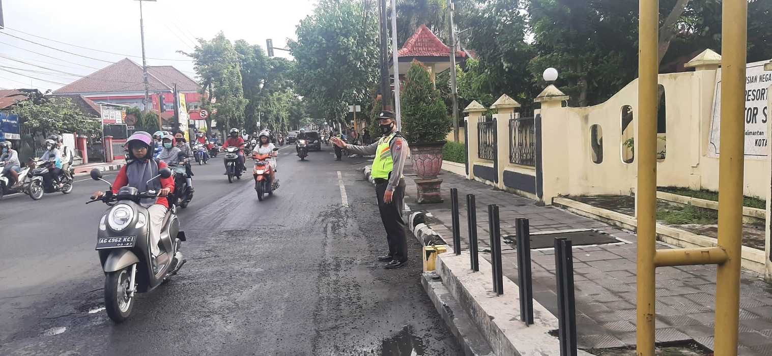 Personel Polsek Sananwetan melaksanakan kegiatan rutin pos pagi sebagai salah satu wujud pelayan kepada masyarakat di penggal-penggal jalan yang dianggap rawan terjadinya laka lantas.