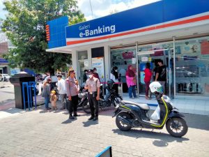 Bentuk upaya mengantisipasi terjadinya kejahatan khususnya Curanmor dan kejahatan serta penerapan protokol kesehatan covid 19 di ATM center bank BRI Cabang Blitar yang ramai dikunjungi oleh Pengunjung , Selasa (1/8/23)