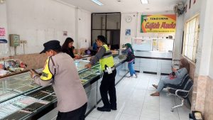 Kali ini patroli yang dipimpin Panit Reskrim Ipda Joni bersama anggota berkesempatan melakukan patroli di pertokoan dan penjualan perhiasan emas lanjut menyampaikan himbauan tentang kewaspadaan terhadap gangguan Kamtibmas.