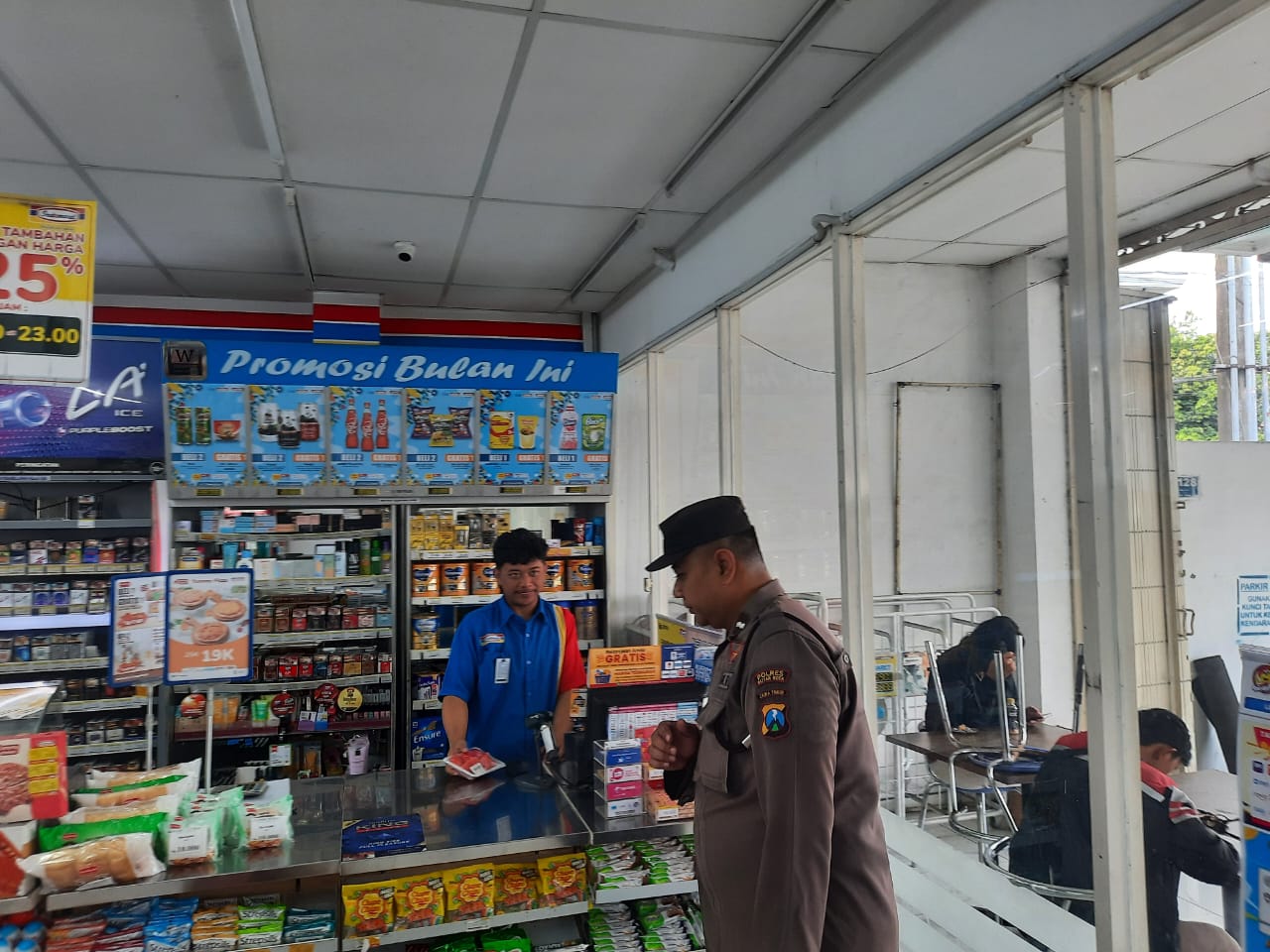 Karyawan Indomaret menyambut positif kehadiran personel kepolisian dan menyampaikan beberapa informasi terkait situasi keamanan di sekitar toko.